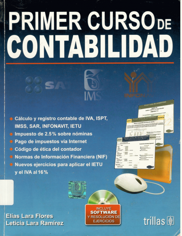 Primer curso de contabilidad : Cálculo y registro contable de IVA, ISPT,IMSS, SAR, INFONAVIT, IETU, impuesto de 2.5 % sobre nóminas, pago de impuestos vía Internet, código de ética del contador, Normas de Información Financiera (NIF), nuevos ejercicios para aplicar el IETU y el IVAal 16% / Elías Lara Flores, Leticia Lara Ramírez. by